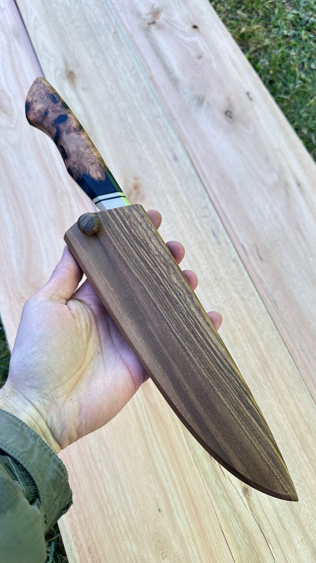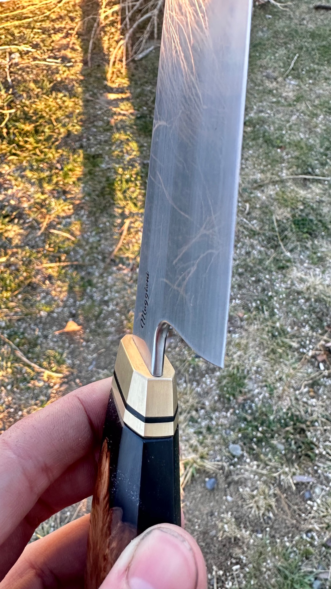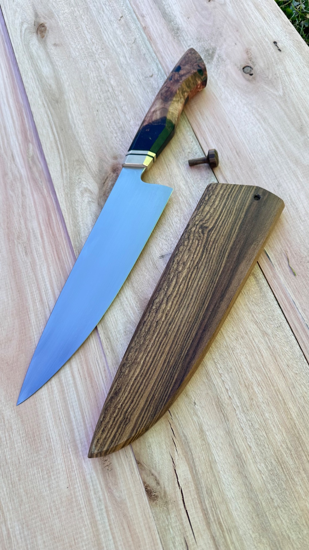 Cuchillo parrillero en la silueta de uno de mis cuchillos de chef. 20cm de hoja en acero al carbono 1095, mango en bronce y un taco híbrido de nudo de coihue con resina negra, y saya en madera de guayubira.