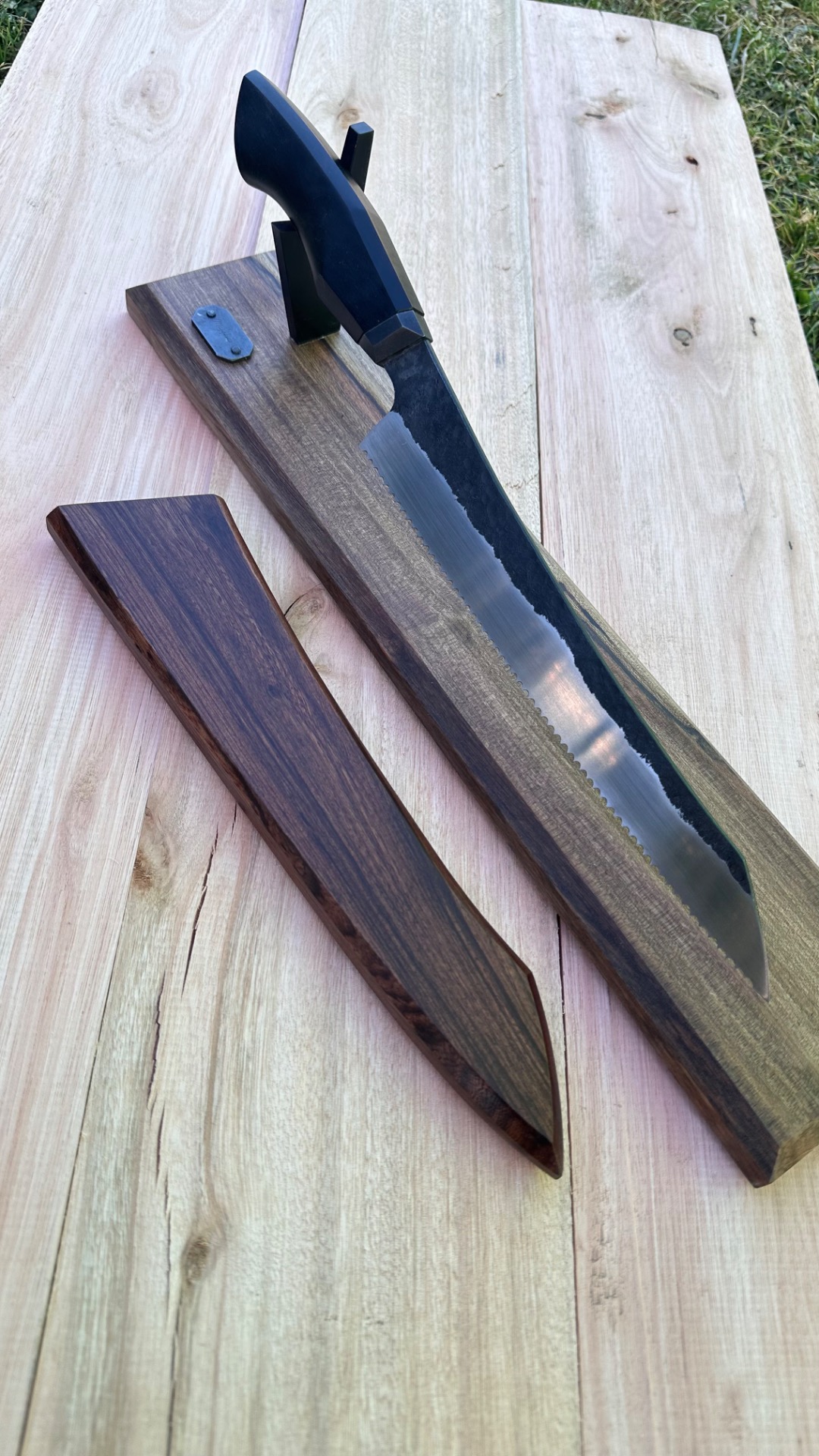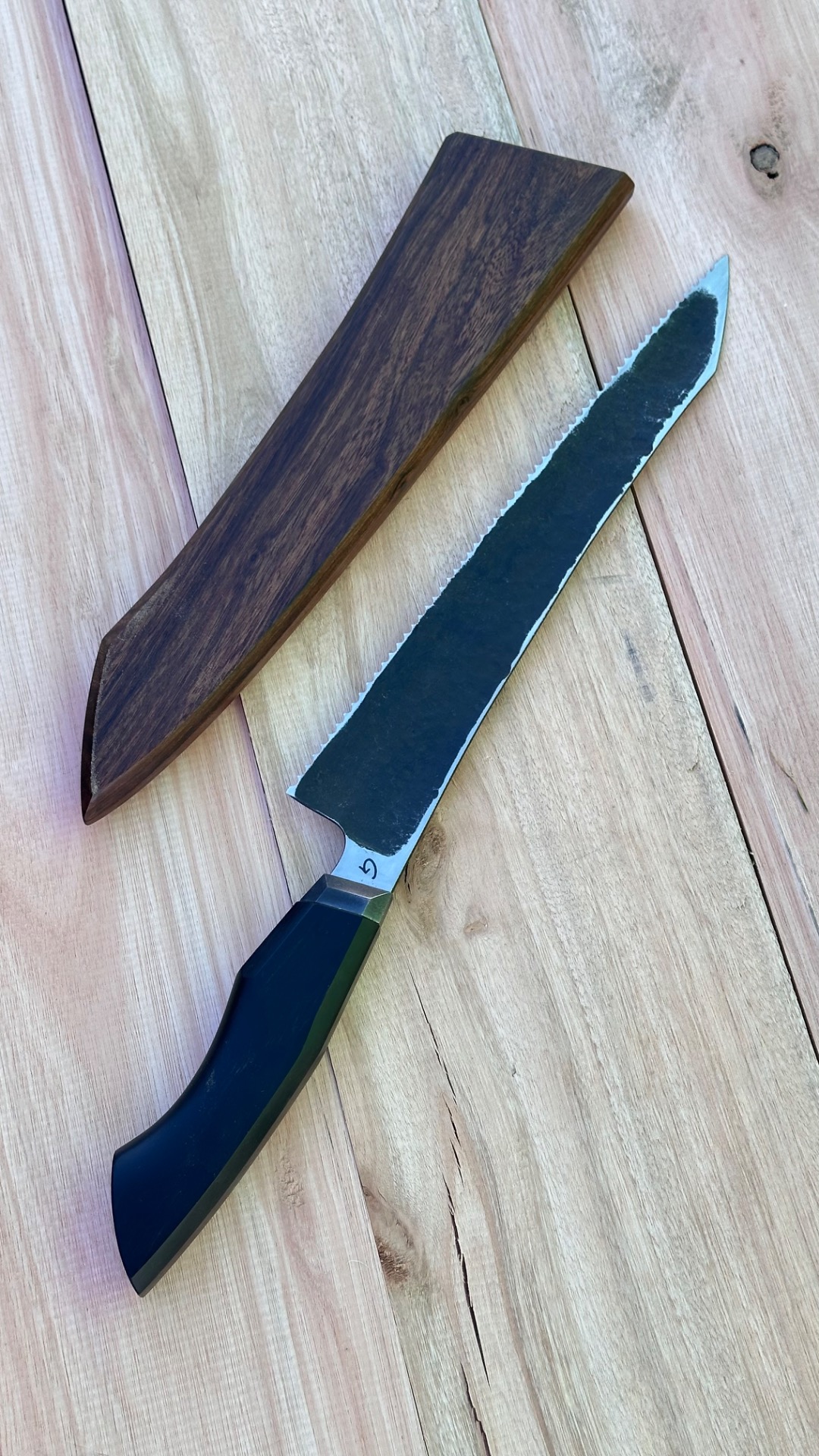 Me decidí por un cuchillo de pan porque los dientes iban acorde a la estética deseada, y lo hice monobisel (diestro) para poder aplicar textura en toda una cara del cuchillo.