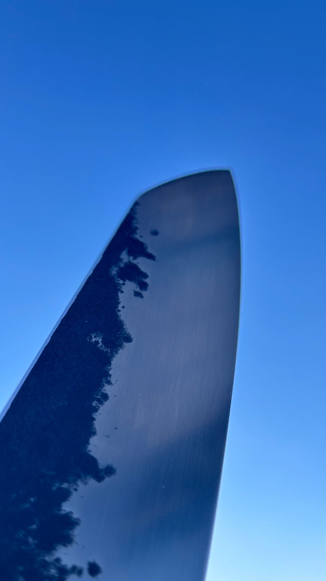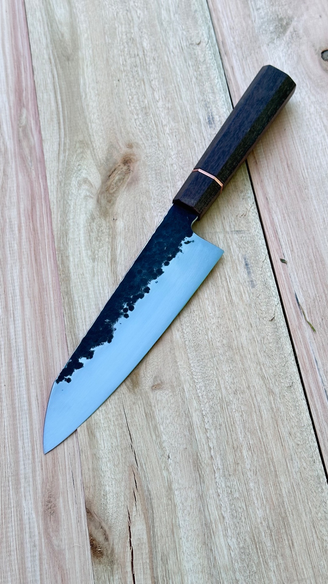 Santoku de 17cm de hoja en acero k110, con un acabado brut de forge en la hoja.