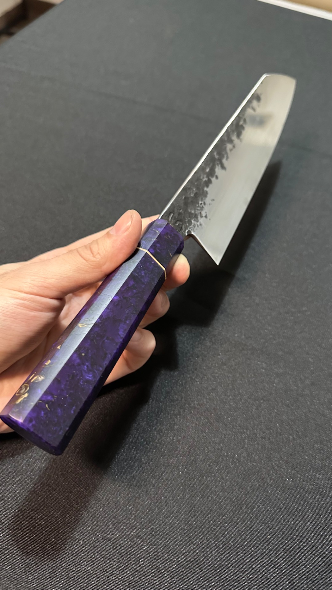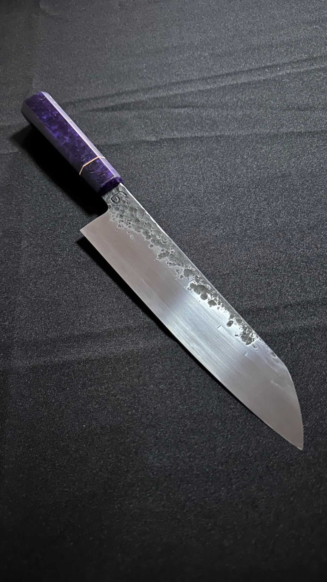 Santoku de 21cm de hoja en acero al carbono 5160, con un acabado brut de forge en la hoja.